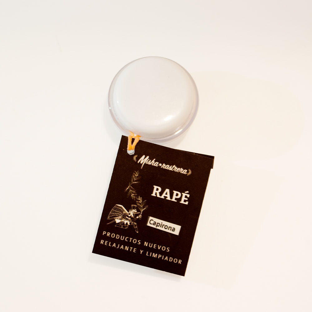 Preparado de hojas de Tabaco mezclado con otras plantas de la selva peruana, tostadas y molidas. Cuando se aplica rapé hay que hacerlo con respeto de parte de quien lo sopla y de quien lo recibe y con la consciencia que se recibe una medicina ancestral que posee el espíritu poderoso de la montaña, del bosque, de la selva y de los espíritus curanderos de cada una de las plantas. Ha sido usado tradicionalmente como una medicina del elemento aire que se recibe por vía nasal, medicina muy fuerte que puede trasladarnos a diferentes estados dependiendo de su uso. Sus efectos y beneficios son a varios niveles tanto en el cuerpo físico, en estados mentales y psíquicos así como en el aspecto espiritual.